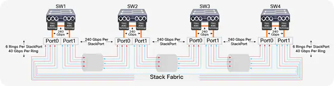 이 기술을 이용하게 되면 최대 8대의 물리적인 스위치를 한 대처럼 운용할 수 있다. 그리고 이 스위치들은 ring topology로 구성된다. 즉, 앞서 설명된 속도는 ring topology내에서 데이터 전송의 throughput이다. Modular uplink를 사용할 경우 stack fabric은 여섯개의 unidirectional data transmission ring들로 구성된다. 하나의 링 (per stackport)이 40G의 throughput을 갖게 되니 6개의 internal stack ring을 고려하면 240G의 속도를 보장한다. 480G의 throughput은 white paper에서 설명하고 있는 것 처럼 "up to 480G of unicast with Spatial Reuse Protocol" 인 경우이다.