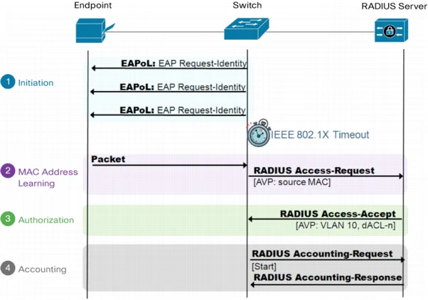 - Inactivity timer - 스위치는 endpoint의 activity를 모니터링 하며 inactivity timer가 만료되면 스위치는 해당 장비의 authenticated session을 삭제한다. 이 타이머는 스위치 port에 정적으로 설정될 수도 있고 RADIUS Idle-Timeout attribute 형태로도 설정이 가능하다. Cisco에서는 RAIDUS attribute을 이용하여 설정하는 것을 권장한다.