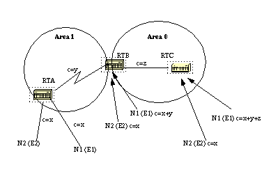 위의 그림을 간단하게 보면 RTA는 두 개의 재분배 경로를 가지고 있다. N1과 N2의 cost는 x이다. 다른점은 Type1, Type2의 차이이다. 따라서, RTB에서 N2의 metric을 확인하면 x, N1은 internal cost까지 합한 x+y가 된다.