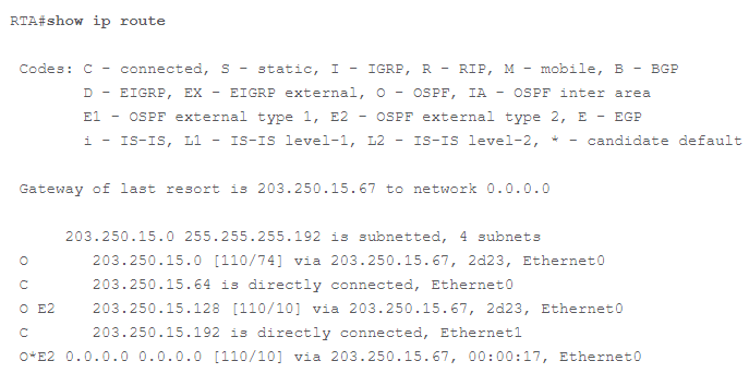 Default-information originate 명령어를 통해서 RTA에서도 metric 10을 갖는 0.0.0.0의 external routes가 생성되었음을 볼 수 있다.