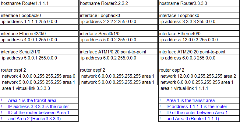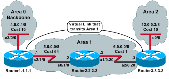 처음 설정을 한 후 Router1.1.1.1과 Router3.3.3.3 사이에 설정된 virtual link는 down이다. Area 1에서 Link-state advertisements (LSA)가 flooding 되고 Shortest Path First (SPF) 알고리즘이 실행되면 Router1.1.1.1은 Area 1을 통해서 Router3.3.3.3과 통신이 가능함을 알게되면 adjacency를 구성하는 것이 큰 그림이다. 참고로 virtual link를 통한 OSPF packets은 multicast packets으로 전달되지 않는다. 여기서는 source는 5.0.0.1 destination은 6.0.0.3인 tunneled packets이다. (FYI virtual link 사이에 firewall이 존재할 경우 OSPF의 port인 89이 enable 되어있는지 확인 필요)